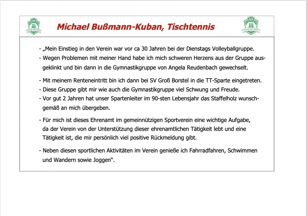 Wir werden jeden Monat den Ehrenamtler des Monats wählen und diesen auszeichnen. Ansprechpartner ist Nicolas Tutic, erreichbar per E-Mail an info@sv-grossborstel.de.